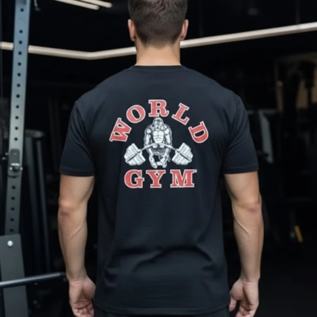 Premium black gym t-shirt featuring a bold World Gym graphic—designed for workouts, training sessions, and everyday athletic style.